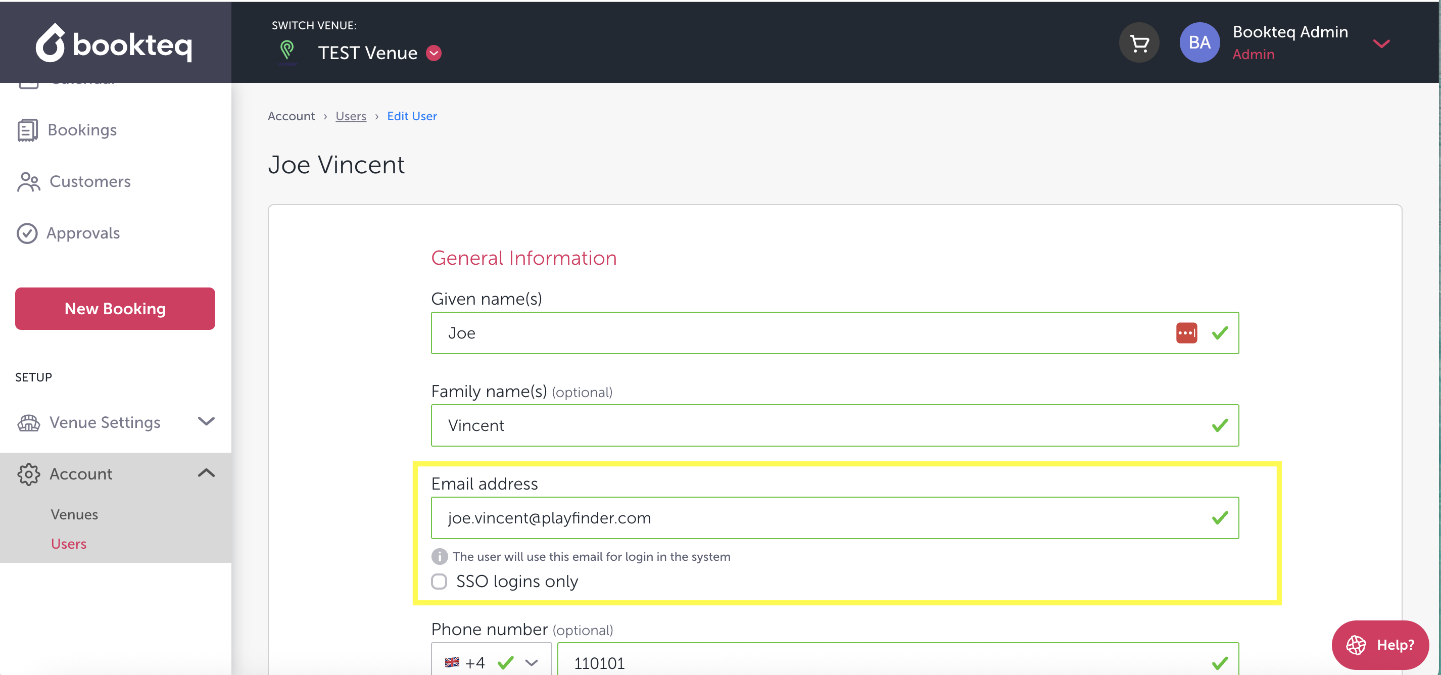 Yes! If you ever need to update or change your venue's registration email on Bookteq, simply go to the Account section and click on Users. Select the Role_Owner as this is the owner of the Bookteq account: