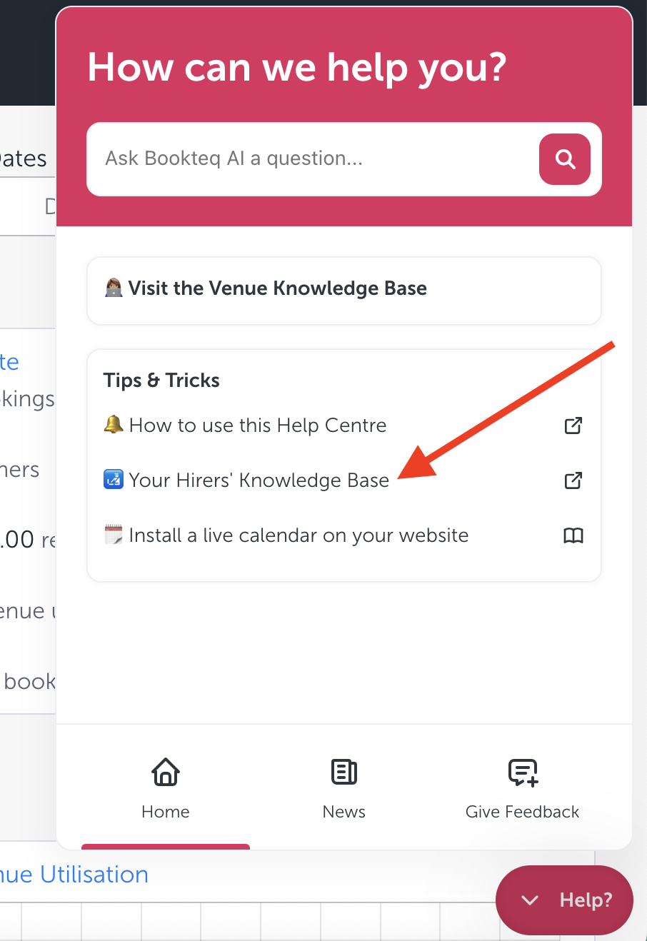 You can also always find the Hirer Knowledge Base on the home page of the Help Centre in your Bookteq Workspace, not to be confused with your knowledge base at the top entitled "Venue Knowledge Base" with information on how to use your Bookteq Workspace.