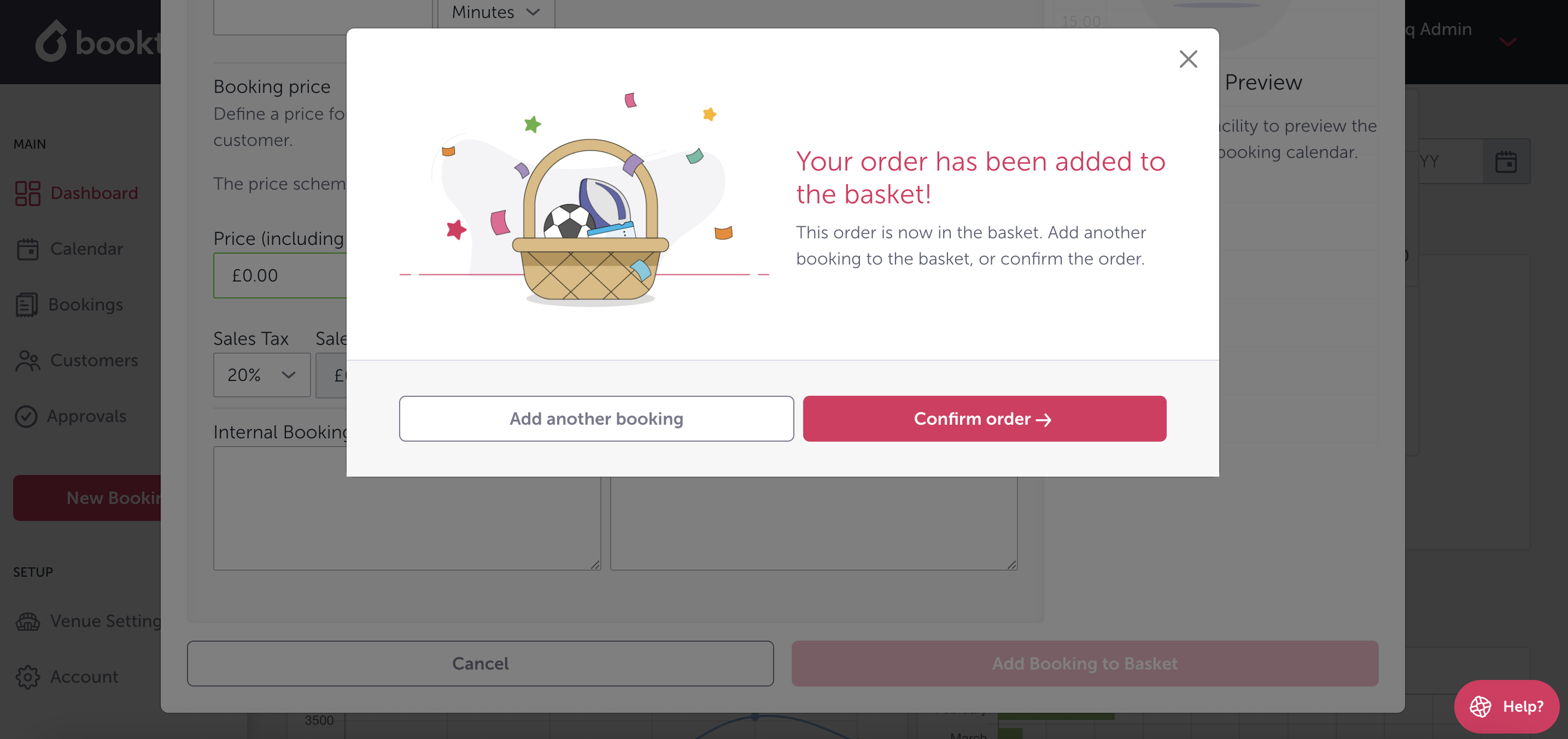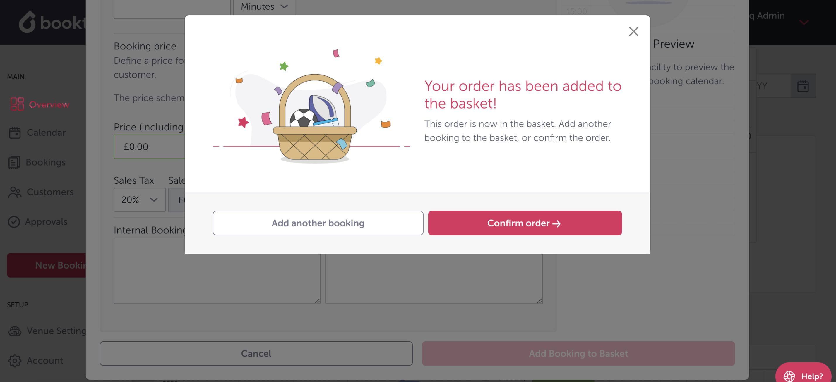 Once these details are confirmed by clicking the Add Booking to basket button, the booking will appear in the Basket where you can confirm the booking.