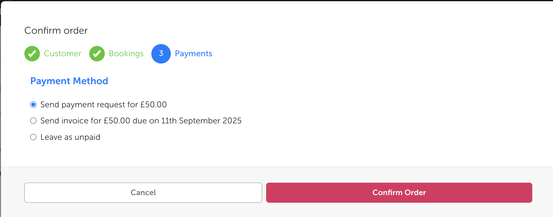 The final step is to select your preferred payment status for this booking. You can either send the payment request immediately, send an invoice for a later date or leave it as unpaid.