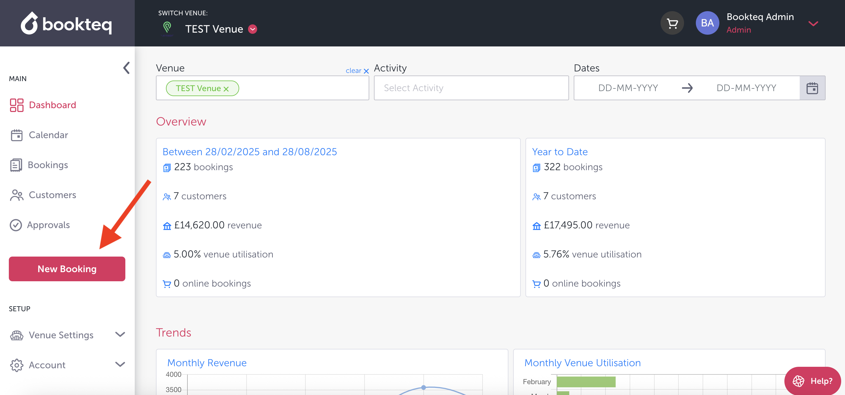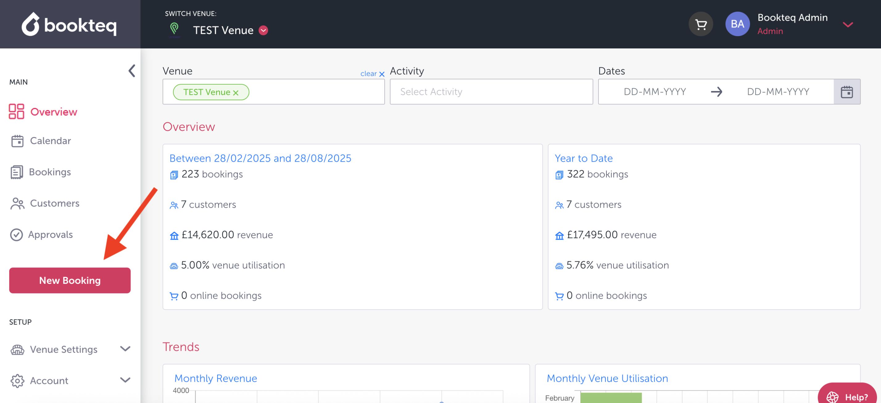 On the main menu on the left-hand side, you will find a red button saying New Booking.