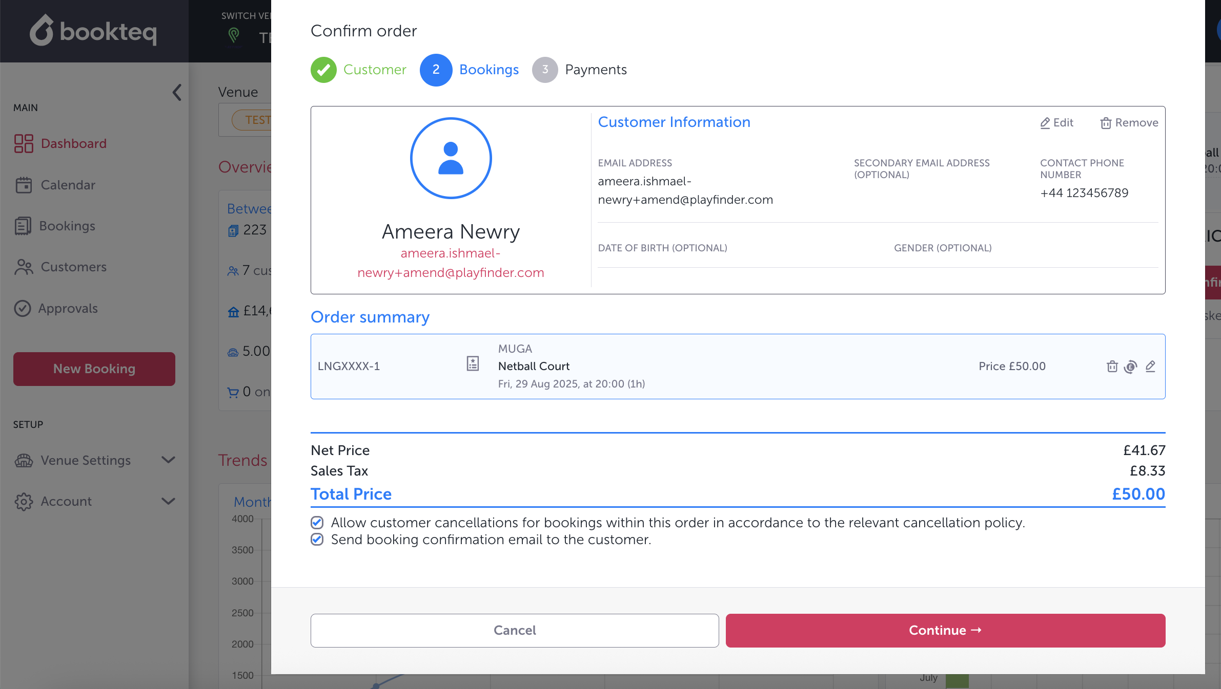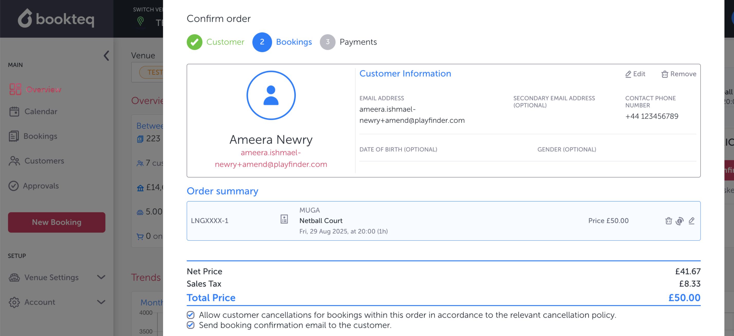 Once you add the customer, you will be able to see the customer's email address and phone number in their customer profile. You will also see an order summary with all of the booking details such as booking reference, space, facility, date, duration, and price.
