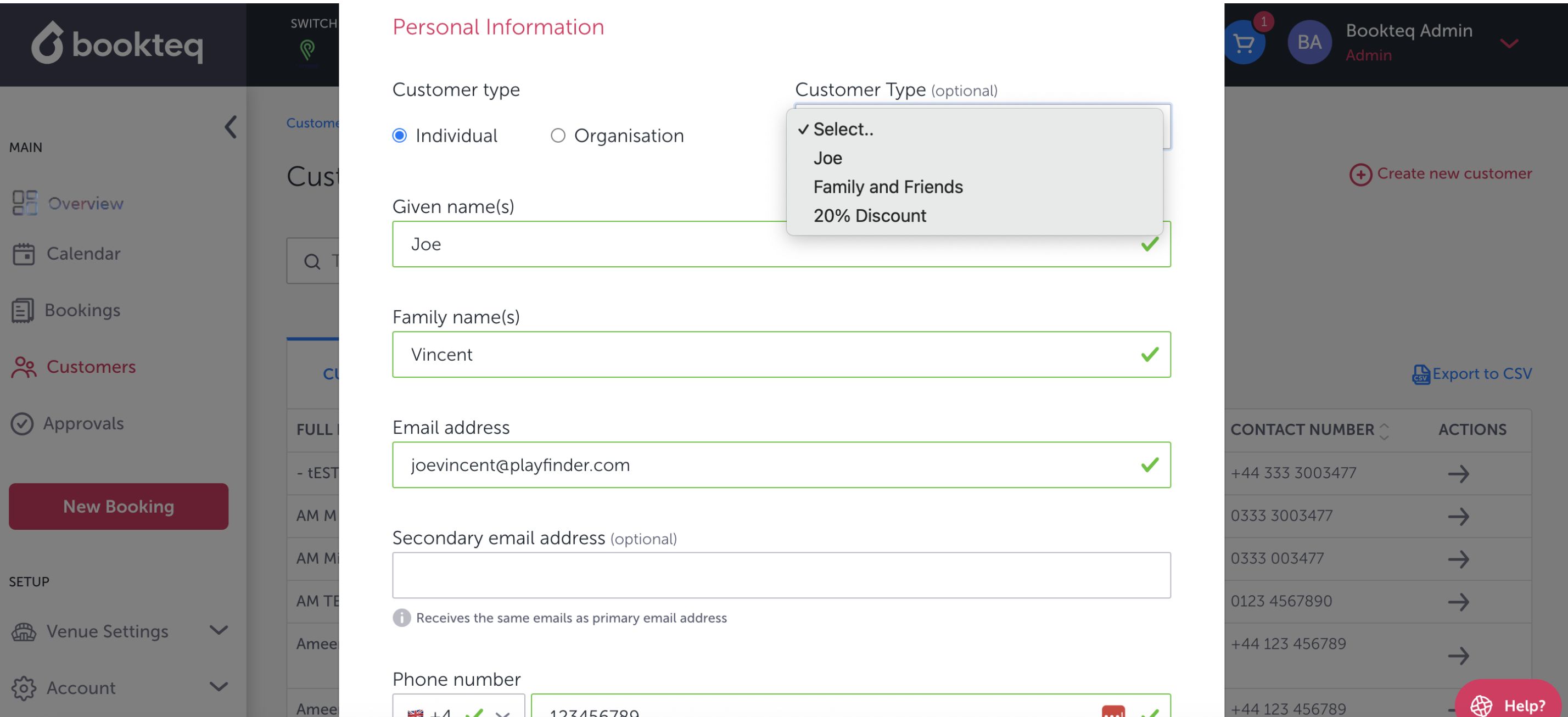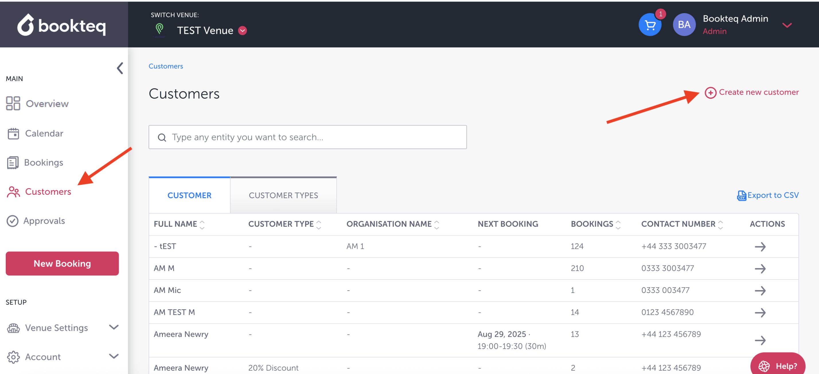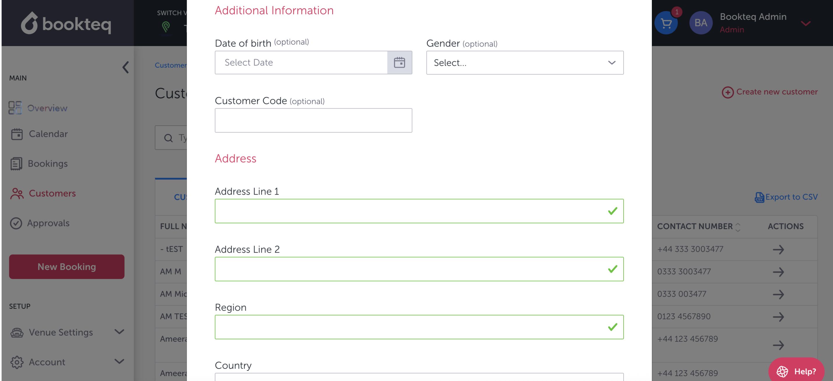 You can create a new customer on Bookteq by pressing on the customer section on the main menu on the left hand side of the screen. A red button will appear on the top right corner saying