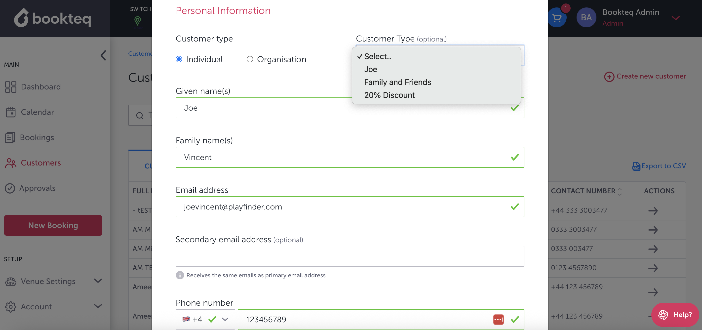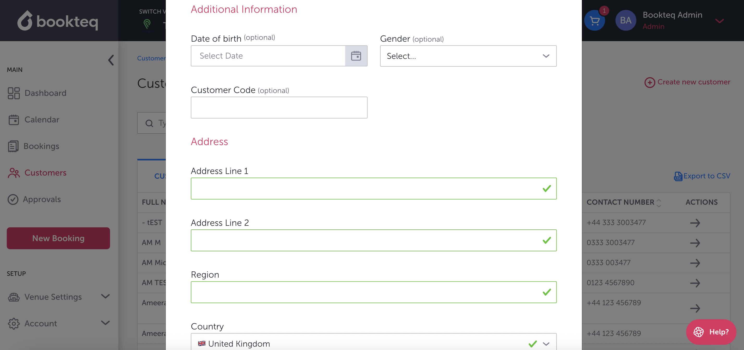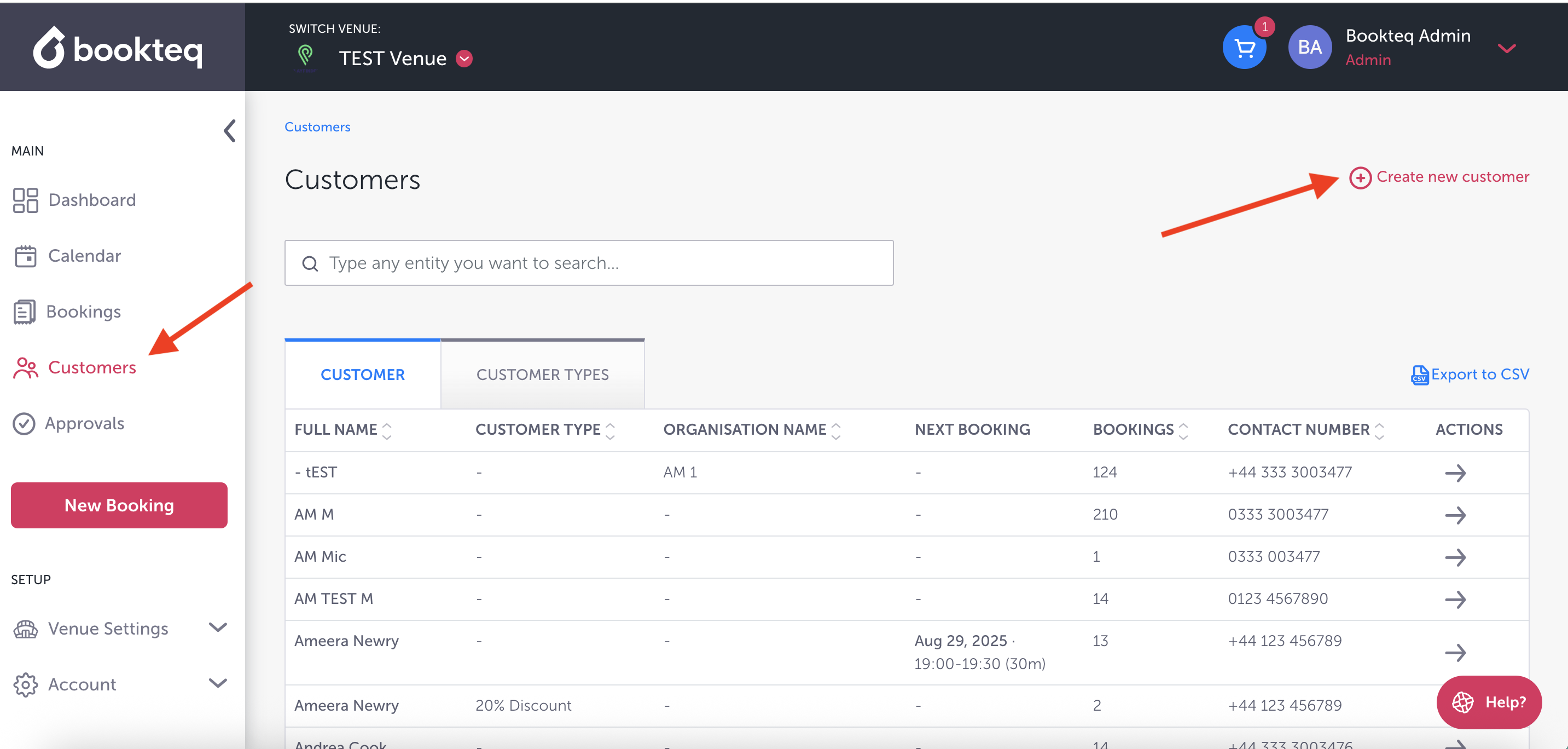 You can create a new customer on Bookteq by pressing on the customer section on the main menu on the left hand side of the screen. A red button will appear on the top right corner saying "Create new customer".