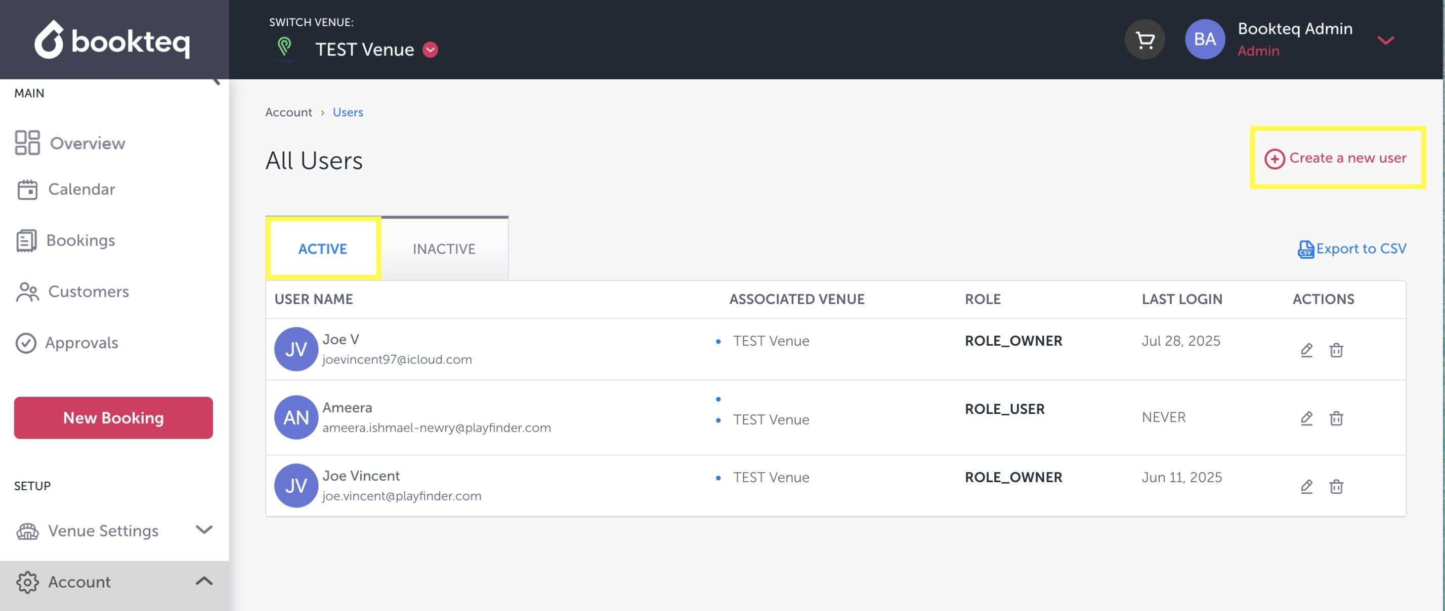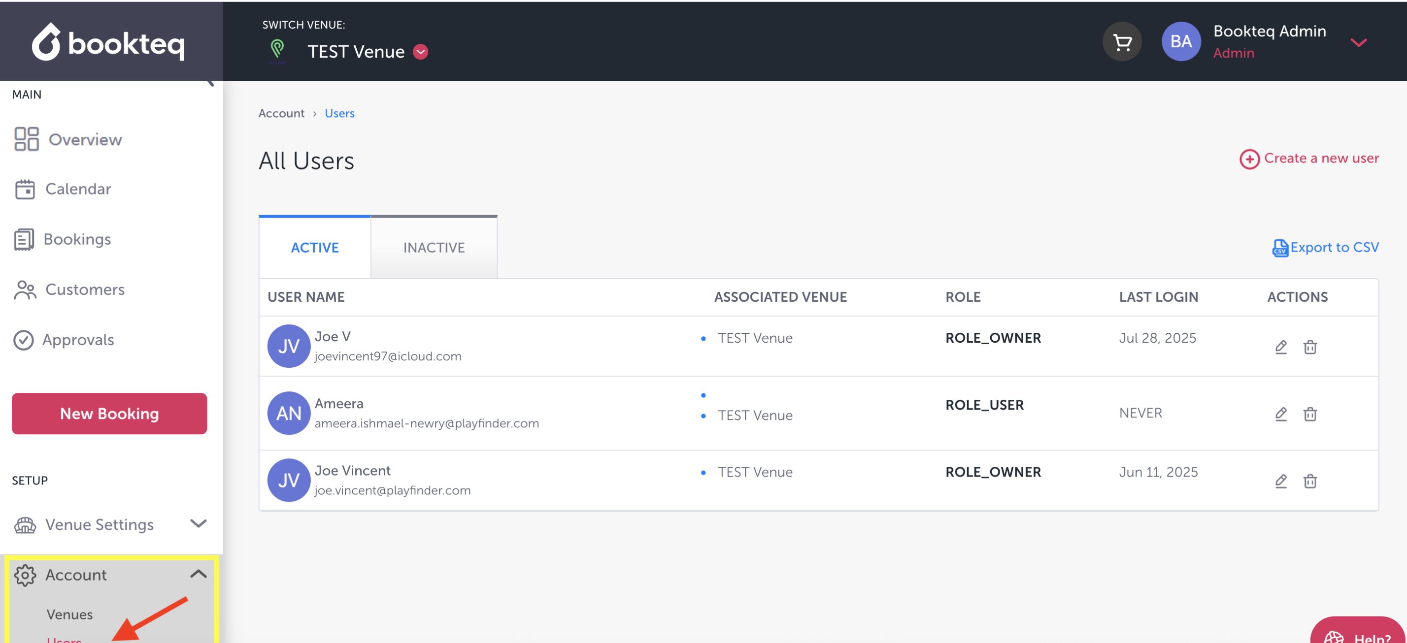 When logged into Bookteq, go to the menu options on the left-hand side of the page and click on Accounts. From the dropdown menu, you can then select the Administrator tab. Please note that 'Owners' will have access to all venues on the associated workspace.