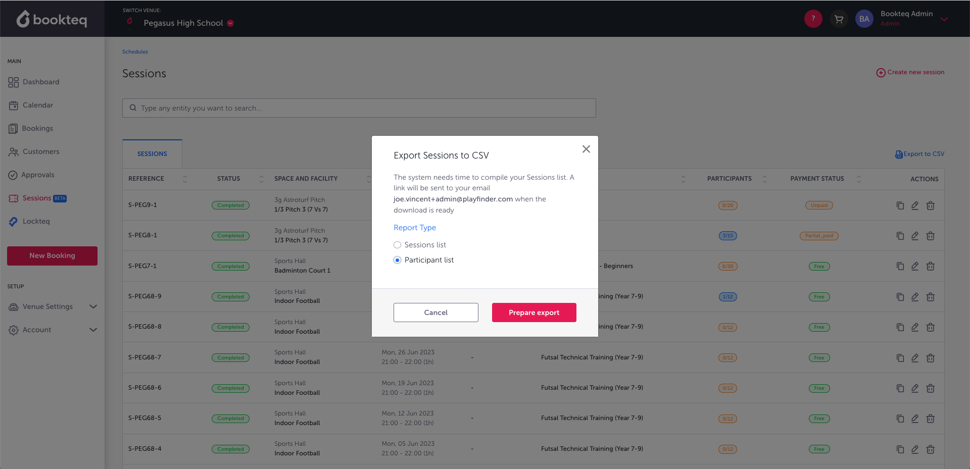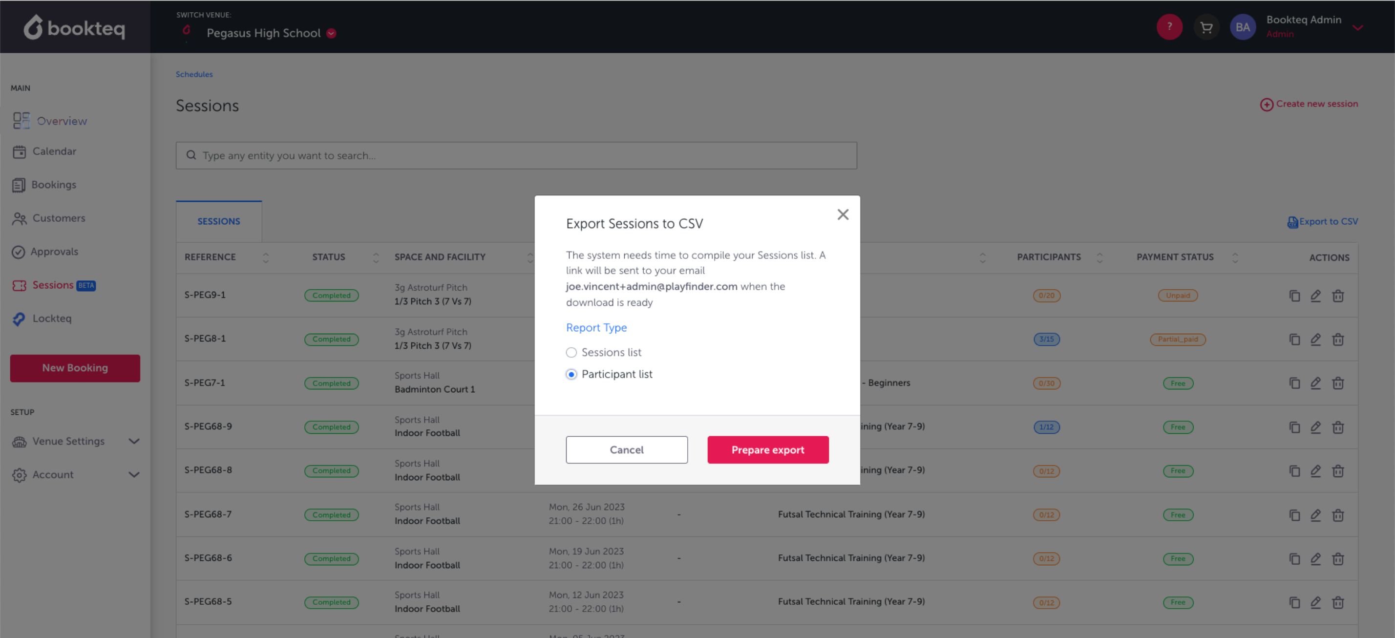 - Navigate to the Sessions feature in your Bookteq workspace.
